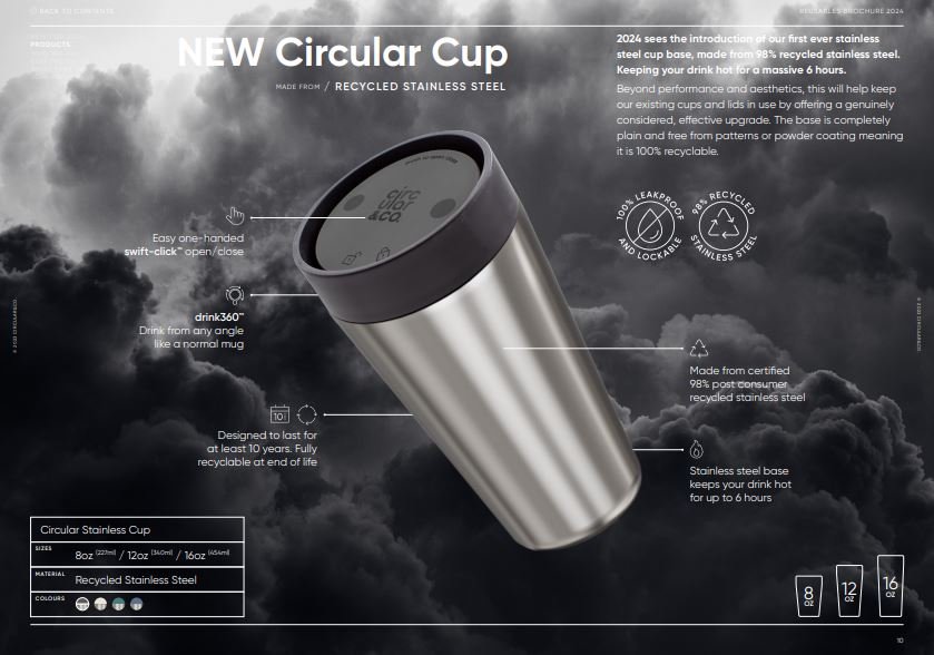 Circular Cups are the world’s first circular solution for reusable coffee cups. This Circular Cup is made from recycled stainless steel, is designed for 10 years of use, and 100% recyclable at the end of life, contributing to a circular economy for coffee cups. Designed with practicality and circularity in mind, our sustainable travel mug is vacuum insulated, double walled, 100% leakproof with locking lid mechanism, providing peace of mind whilst you’re on the go. Circular Cups unique push lid mechanism minimises spills and offers one-hand opening. Enjoy the full coffee flavour with 360-degree drinking.